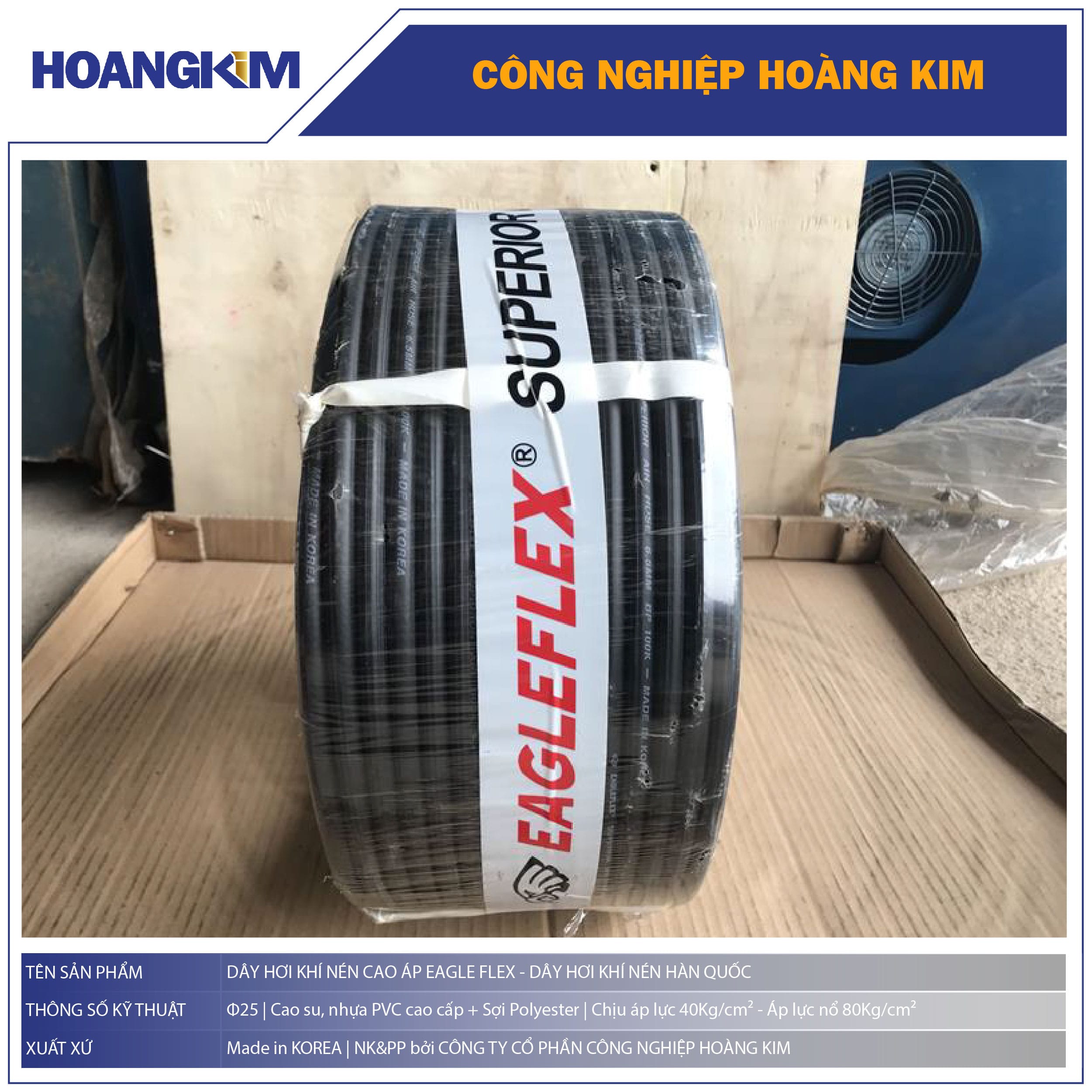 Dây hơi khí nén Phi 25mm EagleFlex là sản phẩm cao cấp nhập khẩu từ Hàn Quốc, chuyên dùng cho các hệ thống máy nén khí, dây chuyền sản xuất, và thiết bị khí nén trong nhà xưởng công nghiệp. Với khả năng chịu áp lực lớn, độ đàn hồi cao và tuổi thọ vượt trội, EagleFlex là lựa chọn tối ưu cho doanh nghiệp cần độ ổn định và an toàn khi vận hành